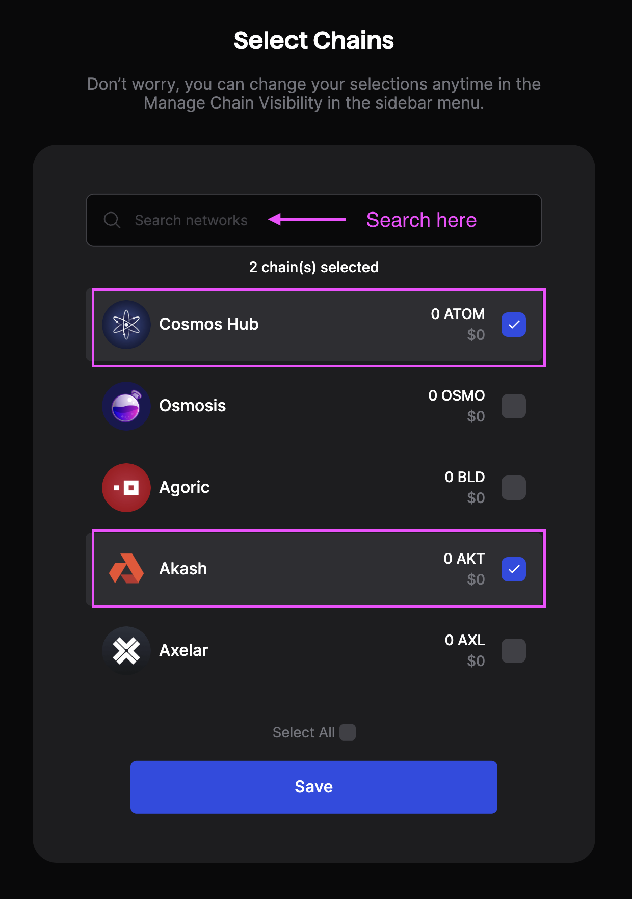 Scroll or through the list or search for the chain you want (in this case **Akash**).